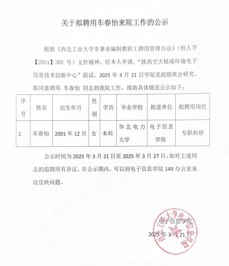 关于拟聘用车春怡来院工作的公示